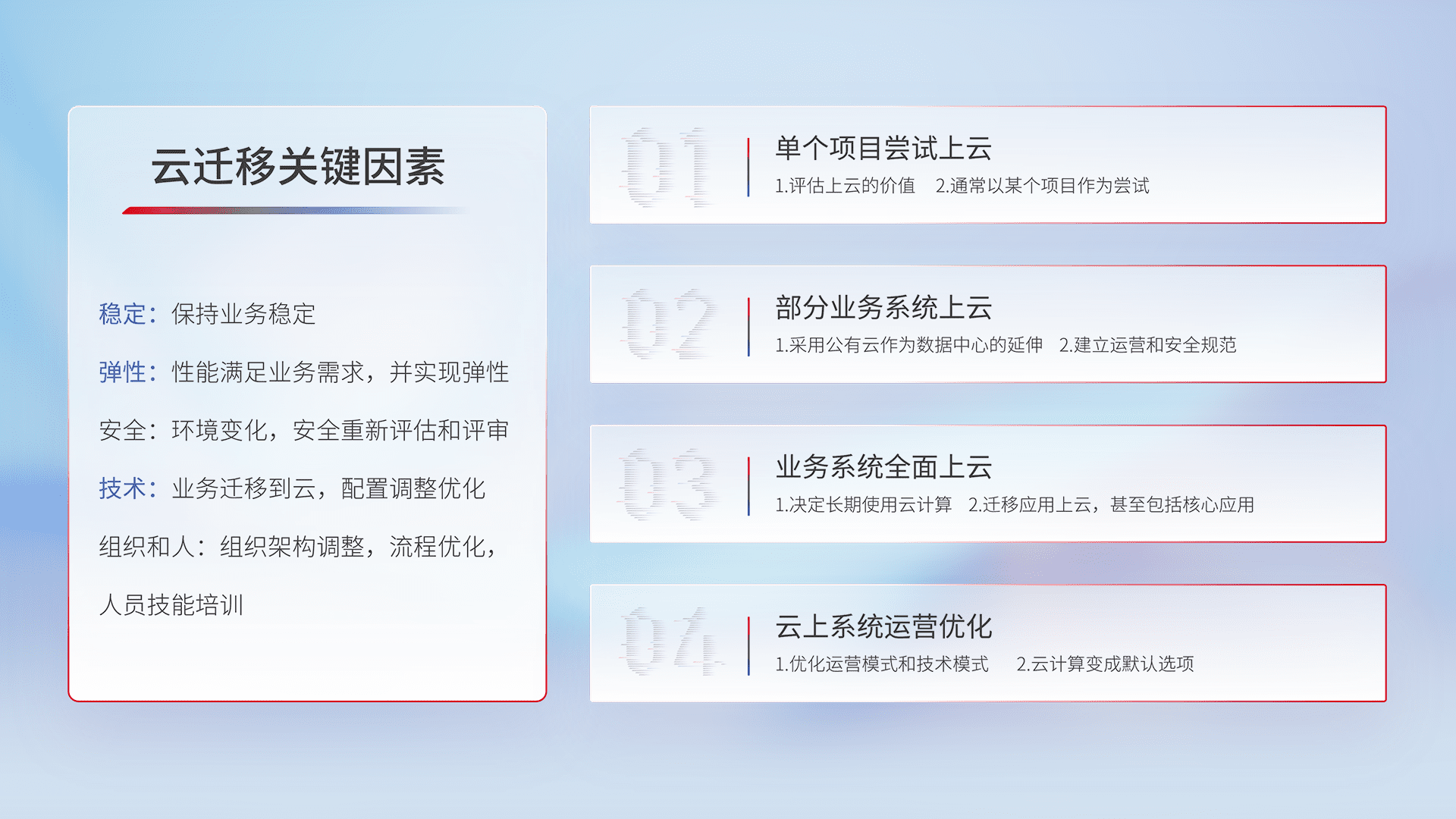 结合实际业务,,,,从规划设计、、、云平台选型、、、、云原生改造、、数据迁移、、、集成交付,,,迁移全过程为客户识别最佳上云路径,,,做好风险识别管理,,设计网络架构、、、身份权限、、安全审计合规、、、、操作审计、、、日志审计、、监控告警策略、、、多站点容灾设计等,,,,对云上基础设施进行整体规划,,,,提升IT治理水平,,,以满足弹性、、、、高可用、、、高性能的需求。。